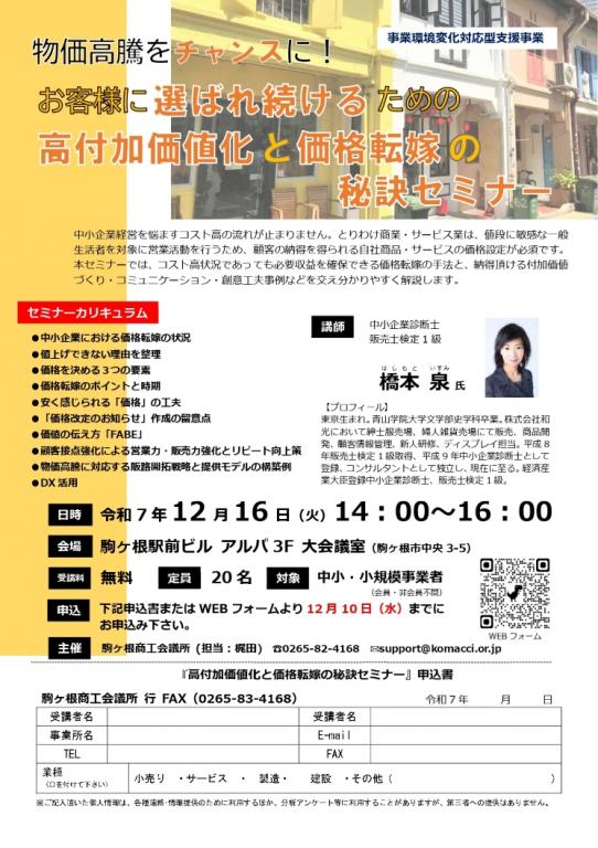 中小企業経営を悩ますコスト高の流れが止まりません。とりわけ商業・サービス業は、値段に敏感な一般生活者を対象に営業活動を行うため、顧客の納得を得られる自社商品・サービスの価格設定が必須です。本セミナーでは、コスト高状況であっても必要収益を確保できる価格転嫁の手法と、納得頂ける付加価値づくり・コミュニケーション・創意工夫事例などを交え分かりやすく解説します。